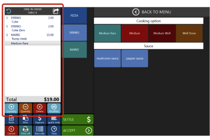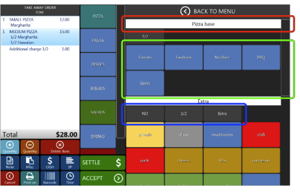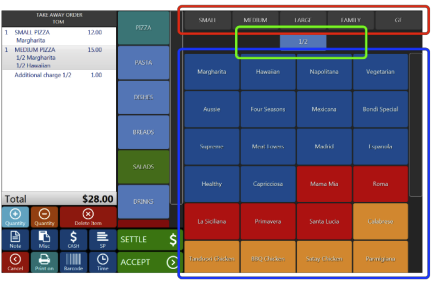 Example: To order small Margharita press Pizza from Menu Group, Small from Menu Options and Margharita from Menu Item. After that the item will be added to the bill on lefthand side and you will be directed to the Modifiers Panel if selected item has active modifiers.
