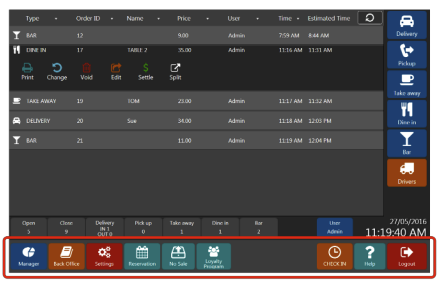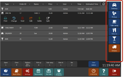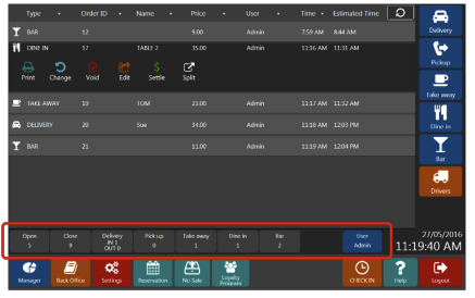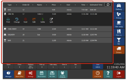 Clicking on the order will open control panel where you can print receipt, change order type, void order, edit order (add more items), settle order or split order into two orders.
